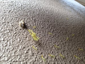 とあるマンションの壁にカマキリの卵とものすごい数のカマキリの子供たちを発見!
